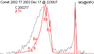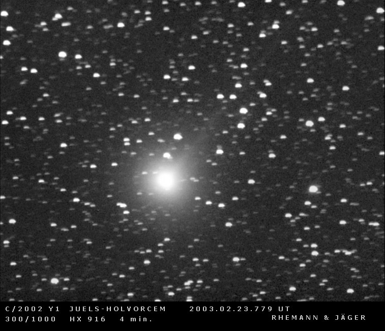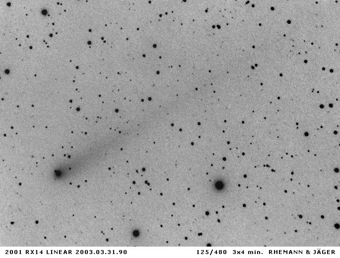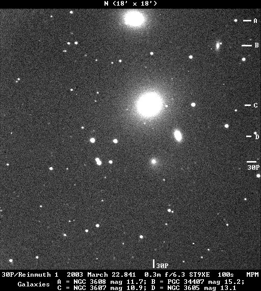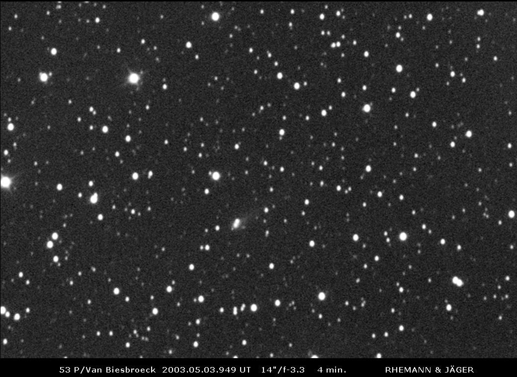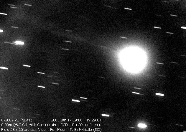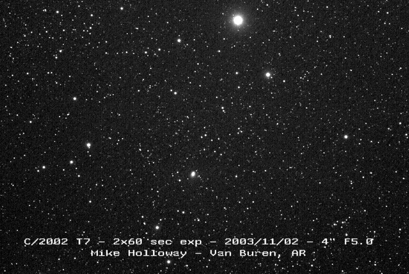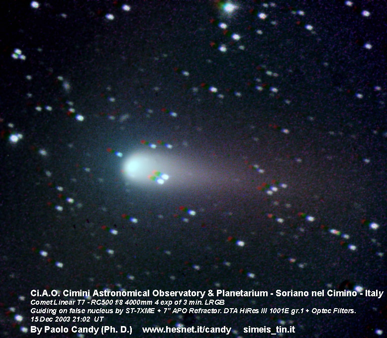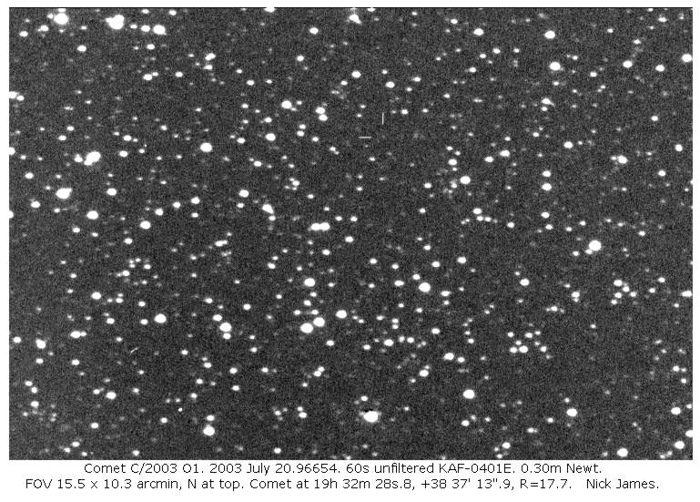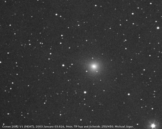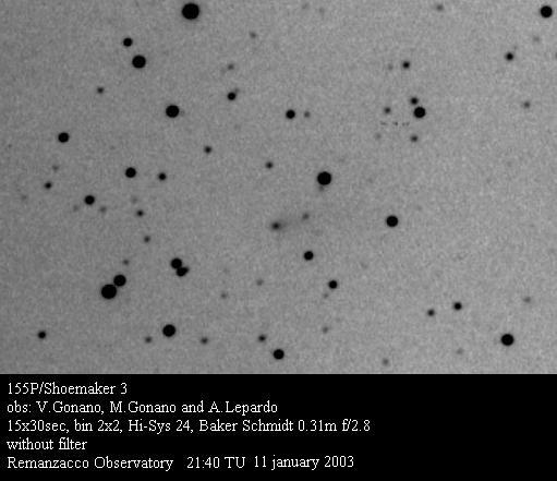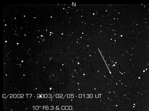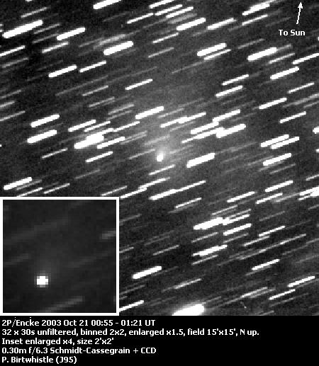 Comets in 20032P/EnckeImages: 2003 August 3 (Birtwhistle). 2003 September 23 (Mobberley), 2003 September 26 (Sostero), 2003 October 15 (Sostero), 2003 October 18 (Holloway), 2003 October 20 (Strange), 2003 October 21 (Birtwhistle), 2003 October 20 (James), 2003 October 25 (Holloway), 2003 October 25 (Sostero), 2003 October 26 (Mobberley), 2003 October 27 (Holloway), 2003 October 29 (Holloway), 2003 November 2 (Montanucci), 2003 November 12 (Oksa), 2003 November 16 (Buczynski), 2003 November 16 (Mobberley), 2003 November 17 (Holloway), 2003 November 20 (Holloway), 2003 November 24 (Weightman), 2003 November 24 (Holloway), 2003 Novemver 26 (Mobberley), 2003 November 27 (Strange), 2003 November 27 (Mobberley), 2003 November 30 (Montanucci), 2003 December 5 (Holloway), 2003 December 7 (Jäger), 2003 December 7 (Jäger).29P/Schwassmann-WachmannImages: 2003 June 26 (Jäger). 2003 September 12 (Montanucci), 2003 September 29 (Sostero), 2003 October 10 (montanucci).30P/ReinmuthImages: 2003 January 12 (Gonano, Lepardo), 2003 January 24 (Gonano), 2003 January 29 (Gonano), 2003 February 1 (Gonano), 2003 February 5 (Gonano), 2003 February 22 (Gonano), 2003 February 23 (Jäger/Rhemann), 2002 March 22 (Mobberley), 2003 March 24 (Jäger/Rhemann), 2003 April 11 (Holloway), 2003 May 25 (James).53P/Van Biesbroeck2003 May 3 (Jäger), 2003 May 23 (Jäger), 2003 June 22 (Jäger).65P/Gunn2003 May 4 (Jäger), 2003 May 24 (Jäger/Rhemann), 2003 June 23 (Jäger).66P/du Toit2003 May 3 (Jäger), 2003 May 24 (Jäger/Rhemann), 2003 May 30 (Jäger/Rhemann).67P/Churyumov-GerasimenkoA potential Rosetta target: 2003 January 12 (Gonano, Lepardo), 2003 February 1 (Gonano), 2003 February 5 (Gonano), 2003 April 8 (Montanucci).81P/WildImages: 2003 January 7 (James), 2003 February 5 (James), 2003 December 27 (Haddix).100P/Hartley 1Images: 2003 May 24 (Jäger/Rhemann).116P/Wild 42003 March 25 (Jäger/Rhemann), 2003 May 3 (Jäger/Rhemann), 2003 May 19 (Montanucci), 2003 May 24 (Jäger/Rhemann), 2003 May 28 (Holloway), 2003 May 30 (Holloway), 2003 July 4 (Holloway).155P/Shoemaker 3Images: 2003 January 11 (Gonano, Lepardo), 2003 January 29 (Gonano), 2003 February 1 (Gonano), 2003 February 5 (Gonano), 2003 February 28 (Jäger/Rhemann), 2003 March 6 (Mobberley),157P/Tritton (=P/2003 T1)Following a suggestion by S. Hoenig (Germany) from orbital computations by M. Meyer (Kelkheim, Germany), Brian G. Marsden has shown that this comet is identical to the lost comet 1978d = 1977 XIII = D/1978 C2 (Tritton), which was observed for only a month. Images: 2003 October 10 (Birtwhistle), 2003 October 16 (Sostero), 2003 October 18 (Sostero), 2003 October 18 (Birtwhistle), 2003 October 22 (Juels), 2003 October 24 (Birtwhistle), 2003 October 25 (Birtwhistle).C/2001 G1 (LONEOS)2003 May 30 (Jäger/Rhemann).C/2001 HT50 (LINEAR-NEAT)2003 January 8 (Holloway), 2003 January 14 (Montanucci), 2003 February 18 (Mobberley), 2003 February 21 (Gonano), 2003 February 27 (Gonano), 2003 March 4 (Gonano), 2003 August 1 (Holloway), 2003 September 26 (Sostero), 2003 September 27 (Montanucci), 2003 October 10 (Montanucci). 2003 October 26 (Mobberley), 2003 November 2 (Montanucci), 2003 November 2 (Holloway), 2003 November 27 (Strange).C/2001 K5 (LINEAR)2003 March 25 (Jäger/Rhemann), 2003 May 24 (Jäger/Rhemann), 2003 May 30 (Holloway), 2003 July 6 (Holloway), 2003 July 6 (Sostero), 2003 July 26 (Holloway), 2003 August 16 (Holloway).C/2001 RX14 (LINEAR)2003 January 3 (Sostero), 2003 January 5 (Montanucci), 2003 January 12 (Holloway), 2003 January 14 (Montanucci), 2003 February 1 (Montanucci), 2003 February 21 (Gonano), 2003 February 22 (Gonano), 2003 February 23 (Jäger/Rhemann), 2003 February 28 (Jäger/Rhemann), 2003 March 2 (Mobberley), 2003 March 24 (Gonano), 2003 March 26 (Holloway), 2003 March 31 (Mobberley), 2003 March 31 (Jäger/Rhemann), 2003 April 4 (Montanucci), 2003 April 8 (Gonano), 2003 April 11 (Holloway), 2003 May 4 (Gonano).C/2002 J5 (LINEAR)2003 June 2 (Jäger/Rhemann).C/2002 O7 (LINEAR)2003 February 28 (Jäger/Rhemann), 2003 April 12 (Holloway), 2003 April 16 (James), 2003 April 21 (Mobberley), 2003 May 4 (Gonano), 2003 May 12 (Holloway), 2003 May 24 (Jäger/Rhemann), 2003 May 28 (Holloway), 2003 May 30 (Holloway), 2003 June 28 (Holloway), 2003 July 4 (Holloway).P/2002 T1 (LINEAR)2003 January 5 (Birtwhistle).P/2002 T6 (NEAT-LINEAR)An object reported as asteroidal independently by the NEAT and LINEAR surveys, and later placed on the NEOCP, has been found cometary in appearance. P. Birtwhistle, Great Shefford, U.K., reports that CCD images taken with a 0.3-m reflector on Oct. 27.9 UT show two faint, thin, straight tails in p.a. 107 deg (36 arcsec long) and 310 deg (39 arcsec long) and a nuclear condensation with diameter about 8 arcsec. Images: 2003 February 1 (Birtwhistle).C/2002 T7 (LINEAR)Images: 2003 January 3 (Birtwhistle), 2003 February 5 (Holloway), 2003 March 4 (Holloway), 2003 March 22 (James), 2003 March 23 (Rhemann/Jäger), 2003 April 1 (Holloway), 2003 July 27 (Holloway), 2003 August 8 (Holloway), 2003 August 23 (Holloway), 2003 September 26 (Sostero), 2003 September 29 (Montanucci), 2003 October 10 (Montanucci), 2003 October 18 (Holloway), 2003 October 25 (Sostero), 2003 October 26 (Mobberley), 2003 October 24 (Montanucci), 2003 November 2 (Holloway), 2003 November 2 (Montanucci), 2003 November 4 (Sostero), 2003 November 16 (Birtwhistle), 2003 November 18 (Montanucci), 2003 November 18 (Montanucci), 2003 November 27 (Birtwhistle), 2003 November 27 (Strange), 2003 November 27 (James), 2003 November 30 (Montanucci), 2003 December 11 (Holloway), 2003 December 14 (James), 2003 December 15 (Mobberley), 2003 December 15 (Candy) 2003 December 17 (Mobbereley), (spectrum) 2003 December 17 (Gavin), 2003 December 18 (Rhemann/Jäger), 2003 December 18 (Mobberley), 2003 December 18 (Gavin), 2003 December 20 (Rhemann/Jäger), 2003 December 21 (Holloway), 2003 December 21 (James), 2003 December 21 (Ward), 2003 December 24 (Holloway), 2003 December 24