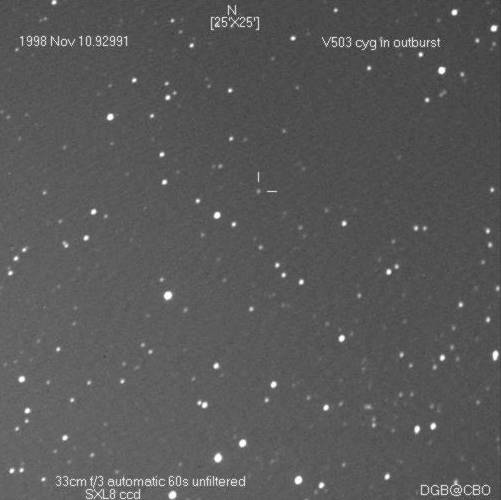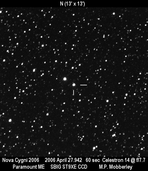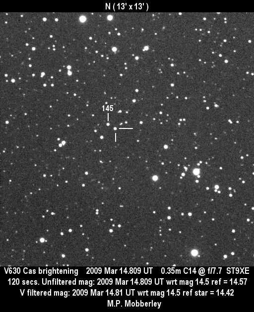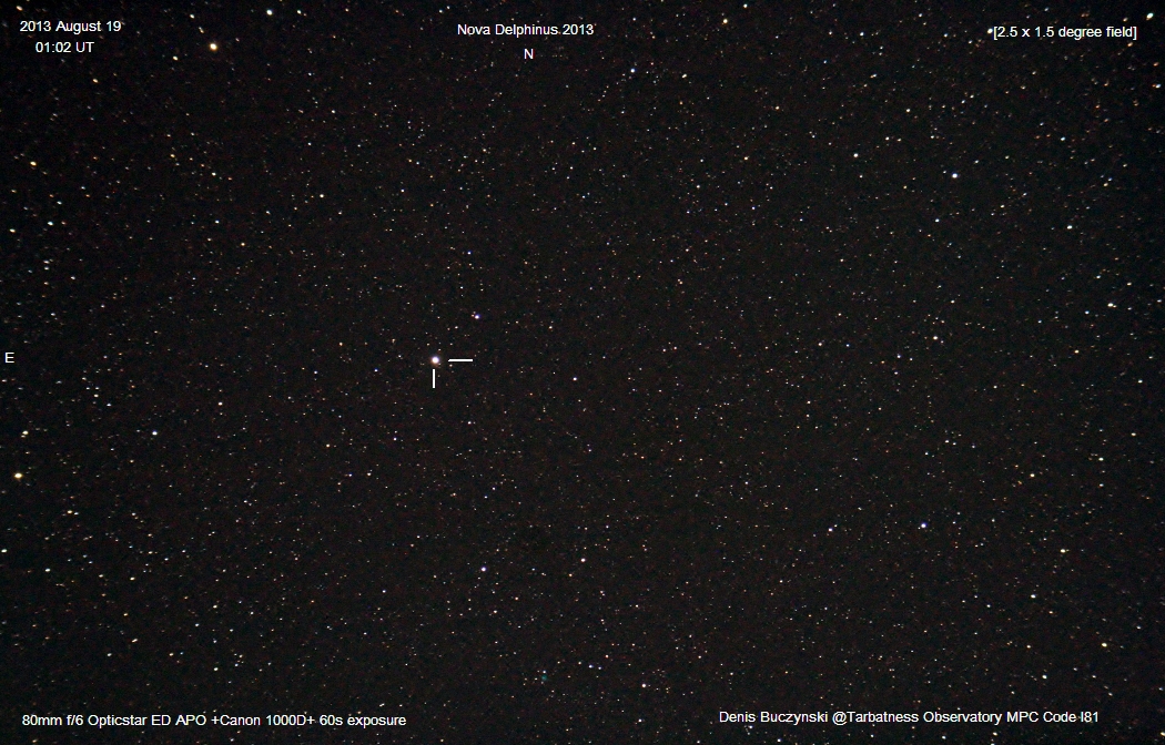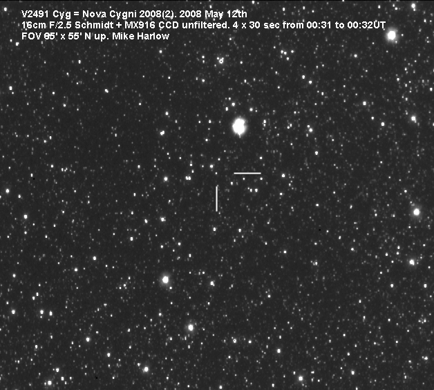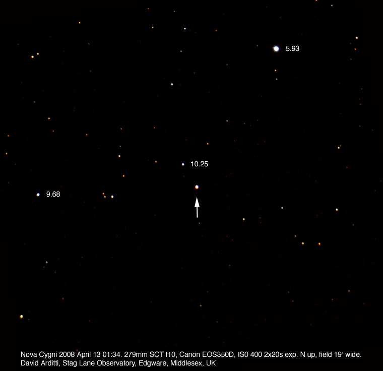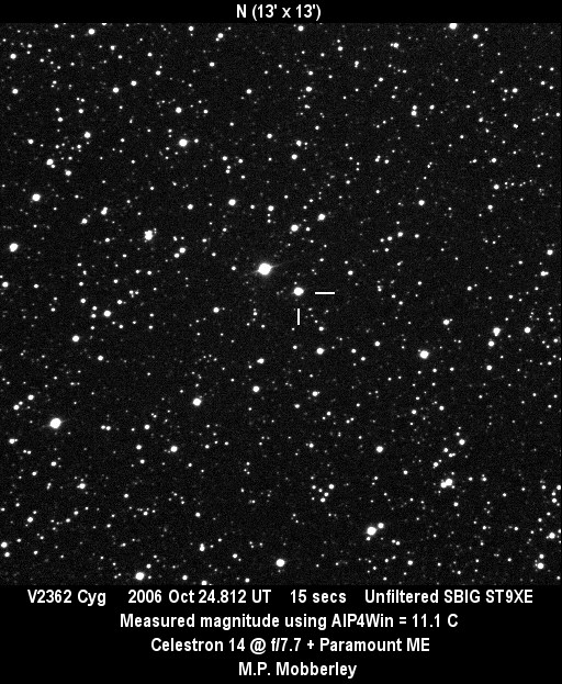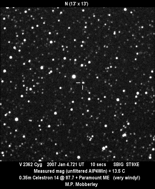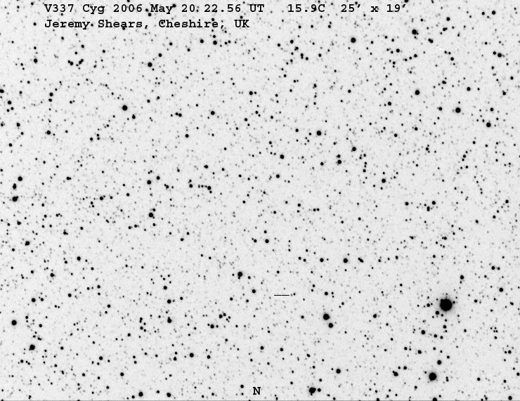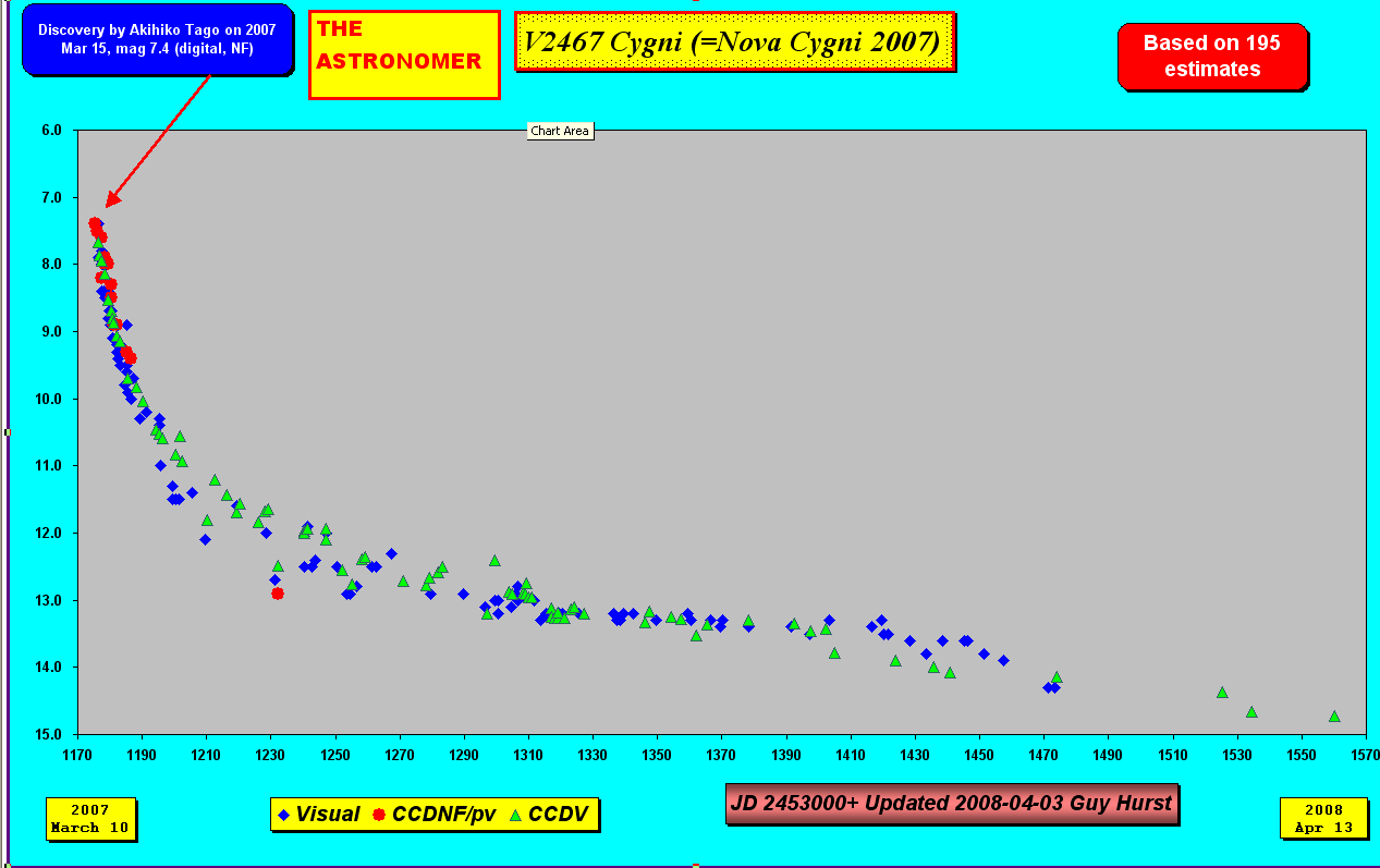 CepN. Cep 2013: 2013 February 19 (James).CMiAQ CMi: PageVSX J074727 065020: 2008 February 10 (Mobberley). CncOJ 287: 2006 May 15 (Mobberley), 2007 January 14 (Mobberley), 2007 April 07 (Mobberley). 2007 April 15 (Mobberley).ComAL Com: PageGO Com: 2006 March 22 (Shears). CygEM Cyg: PageV337 Cyg: 2005 May 29 (Shears), 2006 May 20 (Shears), 2011 May 9 (Buczynski). V503 Cyg: 1998 November 10 (Buczynski) V516 Cyg: Page V811 Cyg: 1997 September 21 (Buczynski) V1028 Cyg: Page V1060 Cyg: 1998 November 10 (Buczynski) V1251 Cyg: Page, 2008 October 21 (Gavin), 2008 October 22 (Mobberley). V1316 Cyg: 2005 September 5 (Shears), V1363 Cyg: Page, 2004 June 30 (Gavin), 2005 August 7 (Buczynski), 2005 August 5 (Shears), V1454 Cyg: 2006 November 23 (Shears). 2009 August 17 (Mobberley). V1974 Cyg = N. Cyg 1992: Page V2274 Cyg = N. Cyg 2001: Page V2275 Cyg = N. Cyg 2001 No. 2: Page V2361 Cyg = N. Cyg 2005: 2005 February 12 (James), 2005 March 3 (Boyd), 2005 March 13 (Buczynski), Lightcurve. V2362 Cyg = N. Cyg 2006: 2006 April 6 (Buczynski), 2006 April 6 (Gavin), 2006 April 10 (Gavin), 2006 April 12 (Gavin), 2006 April 27 (Mobberley), 2006 September 26 (James), 2006 September 26 (Gavin), 2006 October 13 (Mobberley), 2006 October 24 (Mobberley), 2006 December 2 (James), 2006 December 9 (Mobberley), 2006 December 16 (Mobberley), 2007 January 4 (Mobberley), 2007 January 14 (Mobberley), 2007 January 21 (Mobberley), 2007 February 6 (Mobberley), 2007 June 18 (James), 2007 June 18 (James), 2007 July 29 (James), Lightcurve (rev 13). V2467 Cyg = N. Cyg 2007: 2007 June 18 (James), 2007 June 18 (James), Lightcurve (rev 3). V2468 Cyg (N. Cyg 2008 No. 1): 2008 March 9 (Mobberley). 2008 April 8 (Harlow), 2008 April 13 (Harlow), 2008 April 15 (Harlow), 2008 May 1 (Harlow), 2008 May 9 (Harlow), 2008 May 12 (Harlow). Lightcurve (rev 3). V2491 Cyg (N. Cyg 2008 No. 2): 2008 April 12 (Mobberley), 2008 April 13 (Arditti), 2008 April 13 (Arditti), 2008 April 13 (Harlow), 2008 April 15 (Harlow), 2008 May 1 (Harlow), 2008 May 9 (Harlow), 2008 May 12 (Harlow), Lightcurve (rev 1). DelLY Del: PageHR Del = N. Del 1967. (A prototype for N. Cas '95?):Page V339 Del = N. Del 2013: 2013 August 14 (James), 2013 August 14 (Buczynski), 2013 August 15 (James), 2013 August 15 (James), 2013 August 15 (Buczynski), 2013 August 15 (Mobberley), 2013 August 16 (Marsh), 2013 August 16 (Gavin), 2013 August 16 (Buczynski), 2013 August 16 (Buczynski), 2013 August 16 (Storey), 2013 August 16 (Gavin), 2013 August 16 (Gavin), 2013 August 17 (Buczynski), 2013 August 17 (Mobberley), 2013 August 18 (Peach), 2013 August 19 (James), 2013 August 19 (Buczynski), 2013 August 19 (Strange3), Lightcurve (V9). DraCG Dra 2005 April 9 (Shears).CP Dra 2005 August 14 (Shears), 2005 August 14 (Buczynski). DO Dra 2005 March 2 (Buczynski) DV Dra 2005 November 25 (Shears). EX Dra (=HS1804+6753): Eclipses KV Dra: 2006 January 29 (Shears). EriKT Eri (=N. Eri 2009) 2009 November 26 (Mobberley), Lightcurve (ver 10).