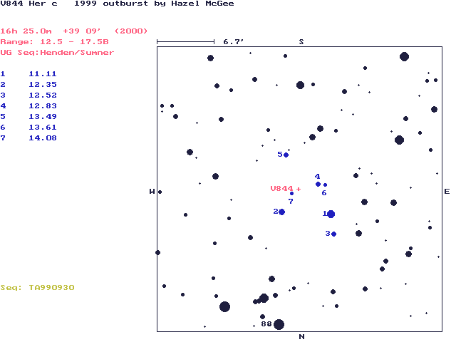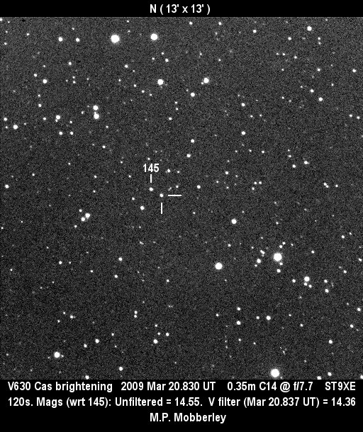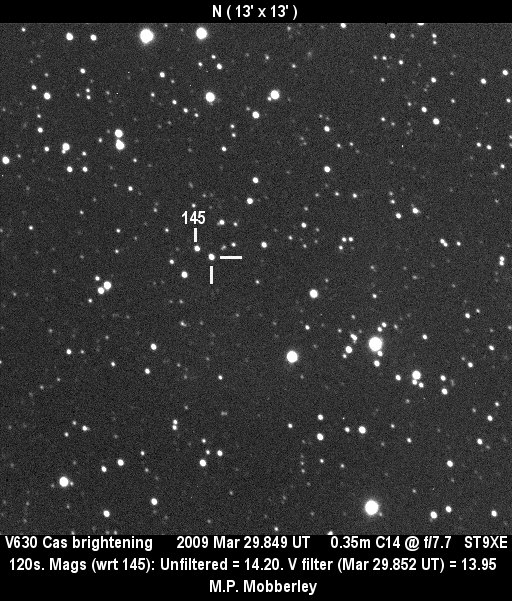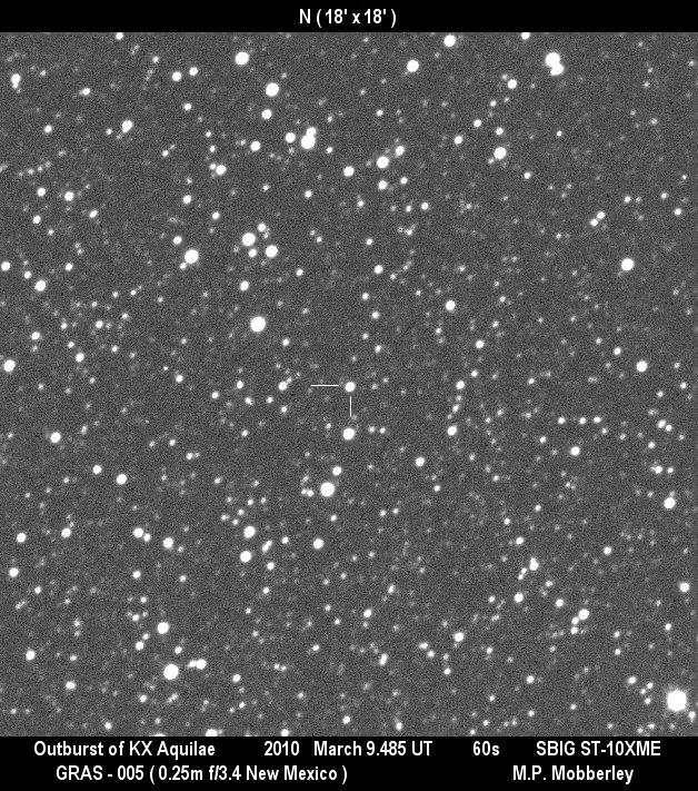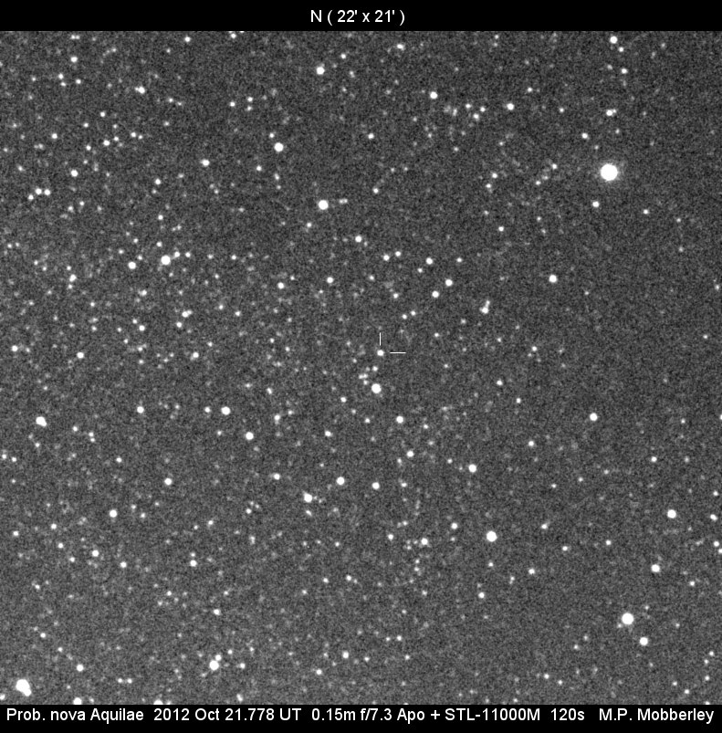 Galactic variables and novaeAndKV And: PageKW And: 1997 September 24 (Buczynski) V402 And: 2000 September 20 (Mobberley), 2005 October 25 (Shears), 2005 October 26 (Shears). V455 And = HS2331+3905: 2007 September 4 (Mobberley), 2007 September 7 (Buczynski), 2007 September 8 (Buczynski), 2007 September 10 (Gavin). V466 And: 2008 September 2 (Shears). AqlCI Aql = N. Aql 1917: PageKX Aql: 2007 May 26 (Shears). 2010 March 9 (Mobberley), 2011 October 27 (Buczynski60cfb), 2011 October 29 (Buczynski120cf). V1425 Aql = N. Aql 1995: Page V1493 Aql = N. Aql 1999: Page V1494 Aql = N. Aql 1999 No. 2: Page V1548 Aql = N. Aql 2001 = TAV J1907+117: Page V1663 Aql = N. Aql 2005: 2005 June 12 (Shears), 2005 June 12 (Buczynski), 2005 June 23 (Gavin), 2005 June 27 (James), 2005 July 16 (Gavin). Lightcurve. V1721 Aql = N. Aql 2008: 2008 September 25 (Gavin), 2008 September 26 (James), 2008 October 1 (Mobberley). V1723 Aql = N. Aql 2010: 2010 September 2 (James). N. Aql 2012 (=PNV J18523496-0018423): 2012 October 21 (Buczynski), 2012 October 21 (Storey), 2012 October 21 (Mobberley), 2012 November 11 (Mobberley), 2012 November 14 (Mobberley). PNV J19150199+0719471 2013 June 1 (Mobberley), 2013 June 2 (Peach), 2013 June 3 (Peach), 2013 June 6 (Peach), 2013 June 8 (Peach), 2013 June 13 (Peach). AqrVY Aqr: 2006 October 7 (Shears), 2006 October 7 (Mobberley), 2006 October 9 (Buczynski),AriSV Ari: 2011 August 3 (Hurst).AurSS Aur: 1998 November 16 (Buczynski)BooUZ Boo: LightcurveCamHT Cam: PageHS0417+7445 = 1RXS J042332.8+745300: 2006 February 15 (Shears). CasDK Cas: 2005 November 4 (Shears).HT Cas: Page V452 Cas: Page, V630 Cas: 2009 February 21 (Mobberley), 2009 March 5 (Mobberley), 2009 March 6 (Mobberley), 2009 March 14 (Mobberley), 2009 March 18 (Mobberley), 2009 March 20 (Mobberley), 2009 March 27 (Mobberley), 2009 March 29 (Mobberley), 2009 April 1 (Mobberley), 2009 April 8 (Mobberley). V705 Cas = N. Cas 1993: Page V723 Cas = N. Cas 1995: Page Tago's variable 2006: (possible microlensing event) Lightcurve.