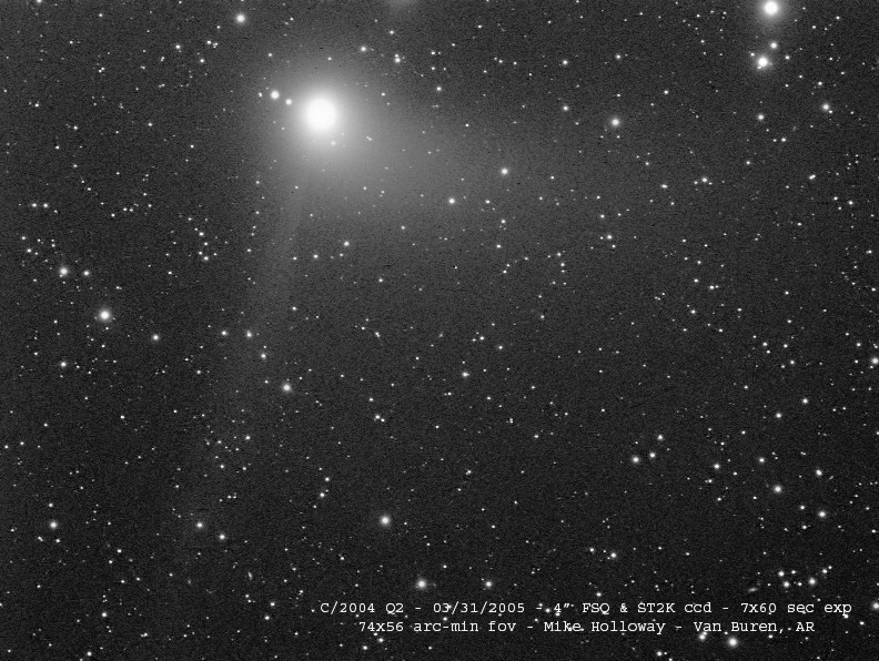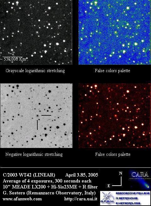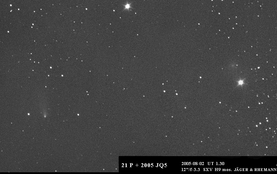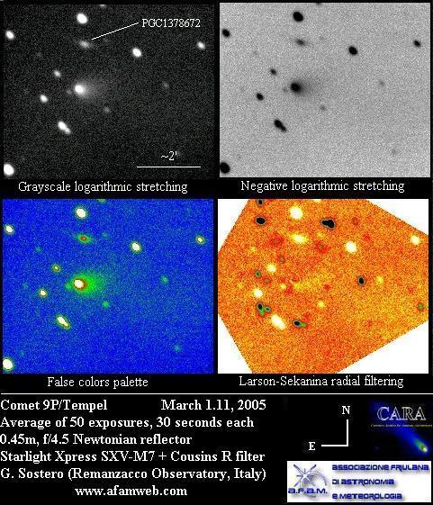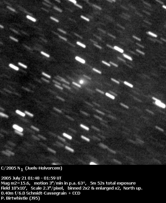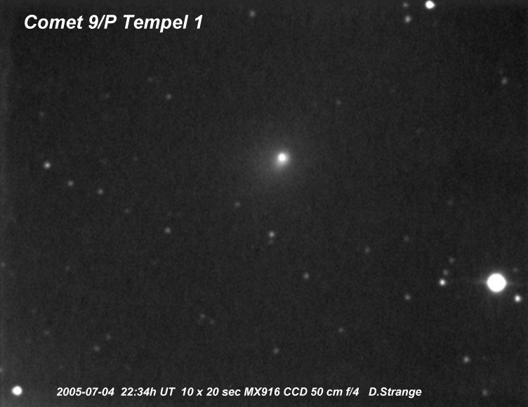 9P/Tempel 1The target for Deep Impact. Pre-impact images: 2004 December 12 (Sostero), 2004 December 19 (Sostero), 2005 January 14 (Holloway), 2005 January 16 (Sostero), 2005 January 20 (Sostero), 2005 February 2 (Sostero), 2005 February 6 (Sostero), 2005 February 9 (Jäger), 2005 February 9 (Sostero), 2005 February 19 (Sostero), 2005 March 1 (Sostero), 2005 March 5 (Holloway), 2005 March 6 (Sostero), 2005 March 14 (Sostero), 2005 March 16 (Sostero). 2005 March 31 (Holloway), 2005 April 1 (Sostero), 2005 April 2 (Jäger), 2005 April 2 (Sostero), 2005 April 3 (Sostero), 2005 April 4 (Sostero). 2005 April 5 (Sostero), 2005 April 8 (Shears), 2005 April 13 (Sostero), 2005 April 15 (Holloway), 2005 April 16 (Sostero), 2005 April 22 (Sostero), 2005 April 22 (Sostero), 2005 April 26 (Sostero), 2005 April 26 (Sostero), 2005 April 26 (Jäger/Rhemann), 2005 April 27 (Montanucci), 2005 April 30 (Jäger/Rhemann), 2005 May 1 (Jäger/Rhemann), 2005 May 1 (Sostero), 2005 May 9 (Shears), 2005 May 9 (Sostero), 2005 May 10 (Mobberley), 2005 May 11 (James), 2005 May 12 (Sostero), 2005 May 25 (Sostero), 2005 May 25 (Montanucci), 2005 May 25 (Sostero), 2005 May 26 (Sostero), 2005 May 27 (Sostero), 2005 May 28 (Mobberley), 2005 May 28 (Sostero), 2005 May 29 (Sostero), 2005 June 2 (Sostero), 2005 June 6 (Sostero), 2005 June 9 (Sostero), 2005 June 13 (Montanucci), 2005 June 15 (Holloway), 2005 June 22 (Sostero), 2005 June 23 (Sostero), 2005 June 26 (Sostero), 2005 June 27 (Jäger/Rhemann), 2005 June 28 (Jäger/Rhemann), 2005 July 4 (Sostero).Post impact images: (Impact time was 2005-07-04 at 05:52:13 UTC as seen from the Earth). 2005 July 4 (Garcia), 2005 July 4 (Montanucci), 2005 July 4 (Strange), 2005 July 4 (Buczynski), 2005 July 4 (Miles), 2005 July 5 (Holloway), 2005 July 6 (Strange), 2005 July 11 (Miles). 21P/Giacobini-Zinner2005 May 2 (Jäger/Rhemann), 2005 August 2 (Jäger/Rhemann).29P/Schwassmann-Wachmann 12005 September 30 (Shears), 2005 October 9 (Jäger/Rhemann), 2005 November 24 (James), 2005 November 26 (James), 2005 November 28 (Shears), 2005 November 29 (James).32P/Comas Sola2005 February 7 (Jäger), 2005 March 1 (Gonano), 2005 March 10 (Chatterton), 2005 March 13 (Gonano), 2005 March 13 (Sostero), 2005 April 3 (Sostero), 2005 April 4 (Jäger),49P/Arend-Rigaux2005 February 7 (Jäger), 2005 March 1 (Gonano), 2005 April 3 (Sostero).62P/Tsuchinshan2005 January 16 (Jäger/Rhemann), 2005 February 9 (Jäger), 2005 February 28 (Gonano), 2005 March 8 (Gonano), 2005 March 13 (Sostero), 2005 April 1 (Sostero), 2005 April 5 (Sostero).69P/Taylor2005 April 4 (Jäger).78P/Gehrels 22005 January 8 (Shears), 2005 January 16 (Sostero), 2005 March 1 (Gonano), 2005 March 13 (Gonano), 2005 March 13 (Sostero), 2005 April 3 (Sostero),101P/Chernykh2005 October 9 (Jäger/Rhemann).105P/Singer-Brewster2005 April 2 (Jäger).117P/Helin-Roman-Alu2005 May 27 (Jäger/Rhemann).141P/Machholz2005 March 1 (Jäger/Rhemann), 2005 March 13 (Jäger/Rhemann), 2005 April 2 (Jäger).161P/Hartley-IRAS2005 June 29 (Jäger/Rhemann), 2005 July 3 (Jäger/Rhemann), 2005 July 9 (Shears), 2005 July 14 (Jäger/Rhemann), 2005 July 11 (Bryssinck), 2005 July 14 (Bryssinck), 2005 July 15 (Bryssinck), 2005 July 17 (Bryssinck), 2005 August 1 (Jäger/Rhemann).169P/NEAT = P/2002 EX12 (NEAT)2005 August 1 (Birtwhistle), 2005 August 5 (Jäger/Rhemann), 2005 August 5 (Jäger/Rhemann), 2005 August 8 (Jäger), 2005 August 12 (Jäger). 2005 September 7 (Jäger/Rhemann), 2005 October 15 (Jäger/Rhemann).C/2002 T7 (LINEAR)Images: 2005 April 3 (Sostero).C/2002 VQ94 (LINEAR)2005 August 1 (Jäger/Rhemann).C/2003 K4 (LINEAR)2005 February 7 (Jäger), 2005 March 5 (Holloway). 2005 October 29 (Holloway), 2005 December 23 (Holloway).C/2003 T4 (LINEAR)2005 January 16 (Jäger/Rhemann), 2005 February 9 (Jäger),C/2003 WT42 (LINEAR)2005 April 3 (Sostero), 2005 October 15 (Jäger/Rhemann),C/2004 D1 (NEAT)2005 October 15 (Jäger/Rhemann).C/2004 K1 (Catalina)2005 April 13 (Sostero), 2005 May 9 (Sostero).C/2004 L1 (LINEAR)2005 April 2 (Jäger).C/2004 Q1 (Tucker)2005 February 6 (Sostero).C/2004 Q2 (Machholz)2005 January: 2005 January 1 (Montanucci), 2005 January 1 (James), 2005 January 1 (Candy), 2005 January 1 (Jäger/Rhemann), 2005 January 1 (Jäger/Rhemann), 2005 January 1 (Sostero), 2005 January 2 (James), 2005 January 2 (James), 2005 January 2 (Weightman), 2005 January 2 (Mobberley), 2005 January 2 (Jäger/Rhemann), 2005 January 2 (Peach), 2005 January 2 (Potter), 2005 January 2 (Holloway), 2005 January 3 (Bosch), 2005 January 3 (Bosch), 2005 January 3 (Montanucci), 2005 January 3 (Sostero), 2005 January 4 (James), 2005 January 4 (James), 2005 January 4 (Broussard), 2005 January 4 (Buczynski), 2005 January 4 (Jäger/Rhemann), 2005 January 4 (Mobberley), 2005 January 4 (Mobberley), 2005 January 4 (Weightman), 2005 January 4 (Peach), 2005 January 4 (Bosch), 2005 January 6 (Jäger/Rhemann), 2005 January 7 (Jäger/Rhemann), 2005 January 7/8 (Jäger/Rhemann), 2005 January 7 (Holloway), 2005 January 7 (Sostero), 2005 January 7 (Montanucci), 2005 January 7 (Broussard), 2005 January 8 (James), 2005 January 8 (Mobberley), 2005 January 8 (Weightman), 2005 January 8 (Sostero), 2005 January 8 (Mobberley), 2005 January 8 (Gavin), 2005 January 10 (James), 2005 January 10 (Mobberley), 2005 January 10 (Mobberley), 2005 January 10 (Montanucci), 2005 January 11 (Sostero), 2005 January 11 (Jäger/Rhemann), 2005 January 12 (James), 2005 January 12 (Mobberley), 2005 January 14 (Montanucci), 2005 January 16 (Holloway), 2005 January 16 (James), 2005 January 16 (Sostero), 2005 January 21 (Holloway), 2005 January 22 (Montanucci), 2005 January 22 (Sostero), 2005 January 27 (Holloway), 2005 January 29 (Shears), 2005 January 30 (Jäger/Rhemann), 2005 January 1-16 (Weightman), 2005 January 30 (Gonano). 2005 February-July: 2005 February 3 (Montanucci), 2005 February 4 (Holloway), 2005 February 5 (Jäger), 2005 February 10 (Holloway), 2005 February 14 (Holloway), 2005 March 1 (Sostero), 2005 March 5 (Hollo